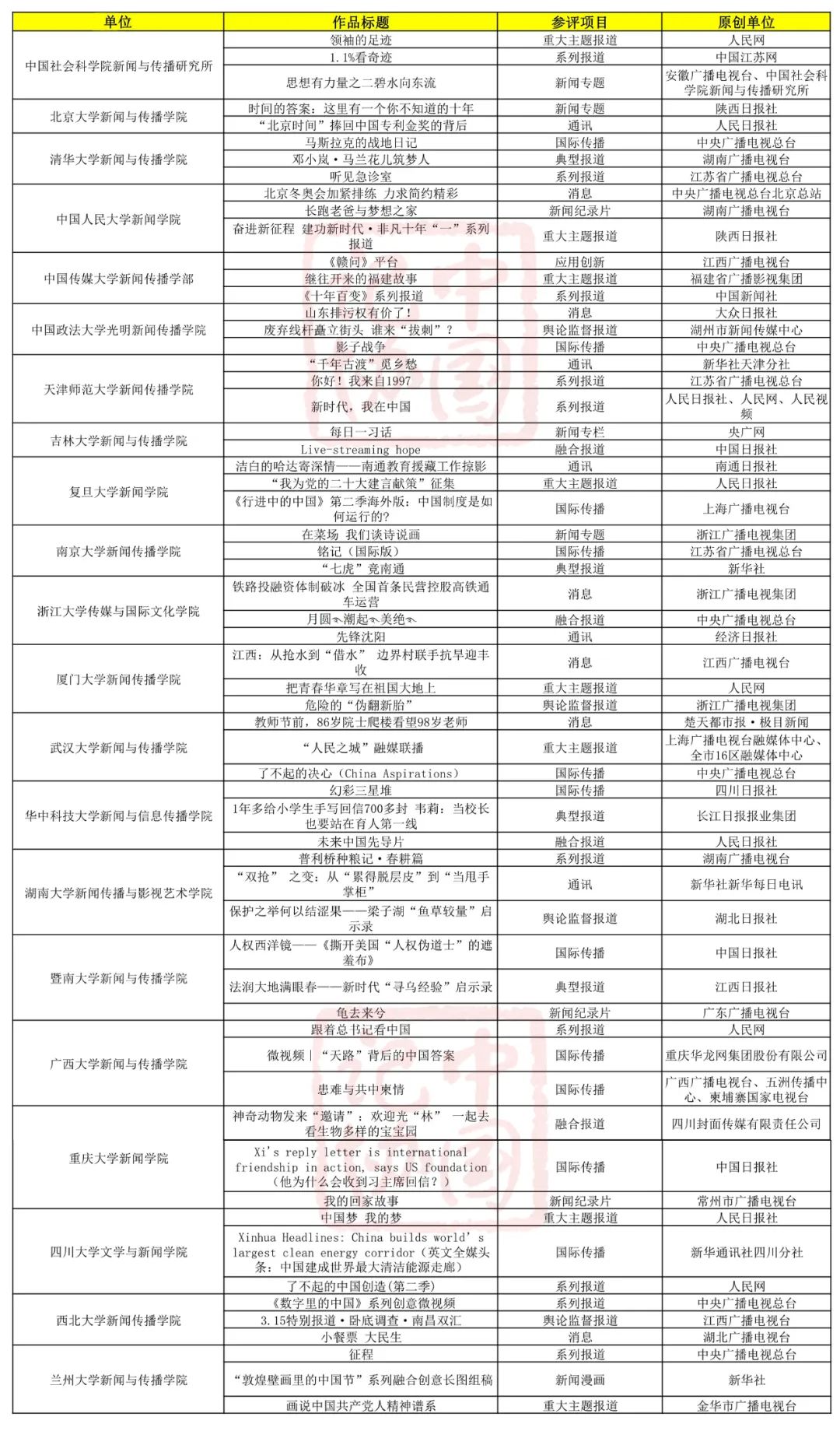近期,按照《中国新闻奖评比主义》《第33届中国新闻奖参评作品报送见告》条件,中国社会科学院新闻与传播筹商所等21家新闻教研机构试点报送单元,持续公示了第33届中国新闻奖保举参评作品。中国记协小编为群众汇总全名单如下: